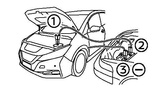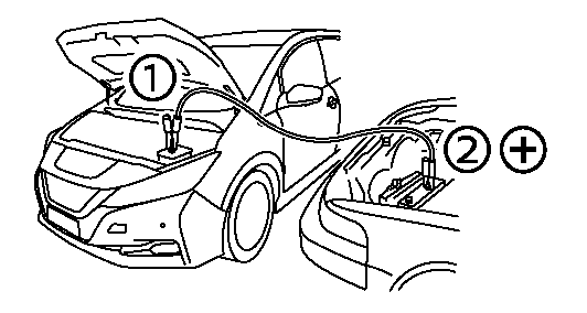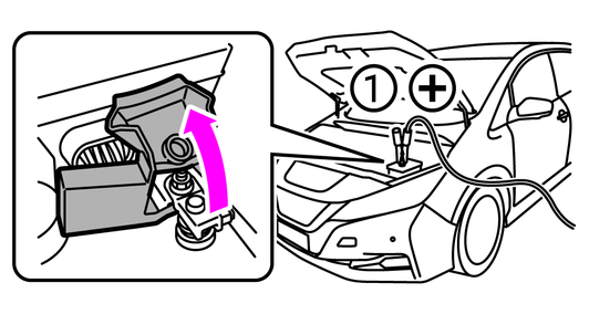 手順2のケーブルの反対側(2)を救援車の12Vバッテリーの⊕端子に接続します。
