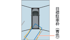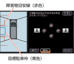 障害物目安線(赤色)が障害物に重ならないように、目標駐車枠(青色)を移動させて駐車位置を決めます。