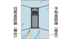予想進路線(橙色)と目標進路線(青色)が重なるように停車させた状態でハンドルを操作します。
