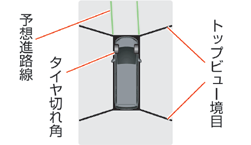 カメラで撮影できない領域(トップビュー境目)が黒色で表示されます。トップビュー境目は、電源ポジションをONにして最初アラウンドビューモニターを表示したときに7秒間黄色で強調表示できます。