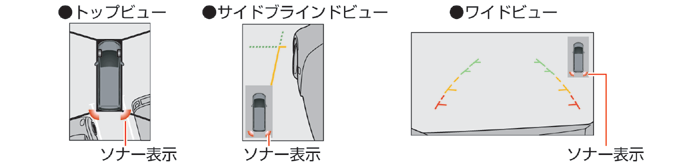 車速約10km/h以下で前進中にソナーが障害物を検知した場合は、自動的にアラウンドビューモニター画面に切り替わり、ソナー表示とブザーでお知らせします。