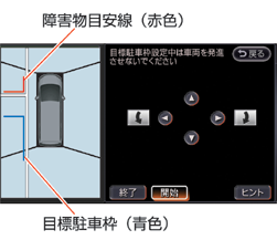 障害物目安線(赤色)が障害物に重ならないように、目標駐車枠(青色)を移動させて駐車位置を決めます。