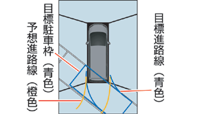 予想進路線(橙色)と目標進路線(緑色)が重なるように停車させた状態でハンドルを操作します。