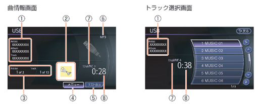 TV・AUXスイッチを押すとUSB操作画面に切り替わります。スイッチを押すごとにモード(ソース)が切り替わります。