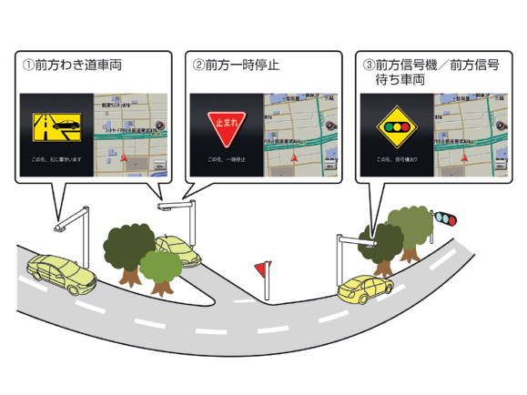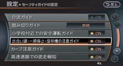 出合い頭・一時停止・信号機の注意ガイドの表示を設定できます。この機能は、VICS(ビーコン)対応キット ◎ の接続が必要です。道路上にDSSS(Driving Safety Support Systems)用の光ビーコンが設置されている場合に、出合い頭、一時停止および信号機の情報を受信すると、走行状況や交通環境に応じて必要性を判断し、音声と画面表示で注意ガイドをします。 (※1) 注意ガイドの必要性は、ナビゲーションシステムで判断しているため、必ずしも常にガイドするものではありません。