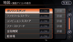地図上にガソリンスタンド、コンビニ、駐車場などの施設アイコンを表示できます。