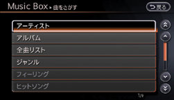 明るい曲、いやされる曲、せつない曲、ノリノリな曲の一覧から選曲できます。