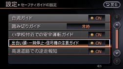 が点灯し、出合い頭・一時停止・信号機の注意ガイドが設定されます。設定がONのときにVICS(ビーコン)対応キット