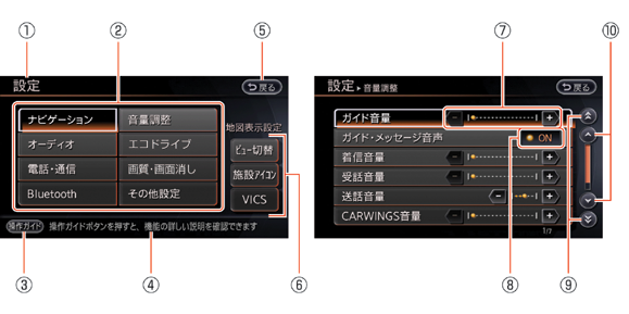 1つ前の画面に戻ります。メニュー画面の先頭の場合は、現在地画面を表示します。