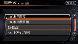 ETCの利用履歴やセットアップ情報の表示、各機能の設定などを行うことができます。