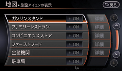 地図上にガソリンスタンド、コンビニ、駐車場などの施設アイコンを表示できます。