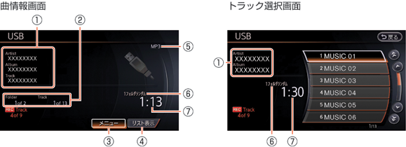 DISCスイッチを押すとUSB操作画面が表示されます。押すごとに、オーディオモード(ソース)が 切り替わります。