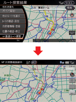 最新の交通情報がダウンロードされ、ルート探索結果画面が表示されます。