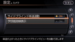 自動OFF機能の設定がONのときは、車速が約18km/h以上になると自動的にサイドブラインドモニター画面から前に表示されていた画面に戻ります。