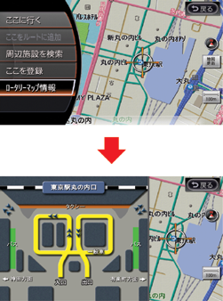 縮尺が50m~1kmのスタンダードビューで表示できます。ロータリーマップが表示可能な場所にはロータリーマーク(