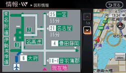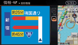 主に進行方向の一般道路と高速道路の、渋滞・リンク旅行時間・規制・駐車場情報・区間旅行時間などを表示します。