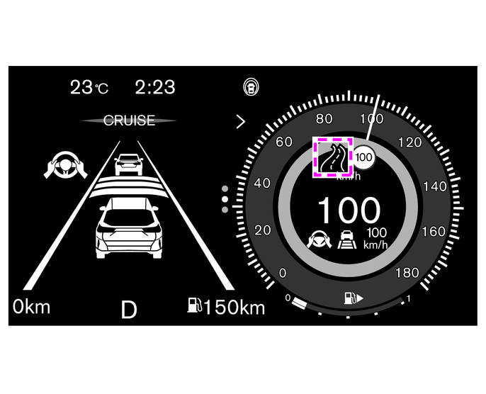 高速道路や自動車専用道路など限定された道路を走行中にメーカーオプションナビゲーションシステムの地図データを利用して、カーブ・出口などの道路形状に合わせて車速を調節します。