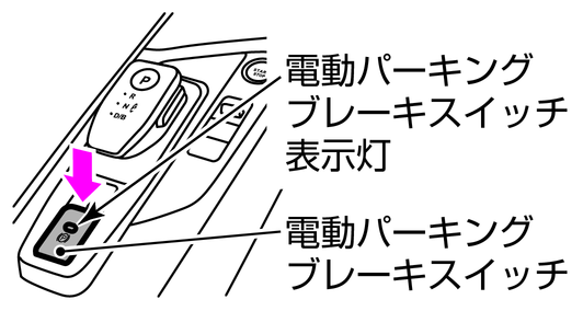 スイッチを押し下げると、電動パーキングブレーキスイッチの表示灯が消灯し、電動パーキングブレーキが解除されるとメーター内の電動パーキングブレーキ警告灯が消灯します。