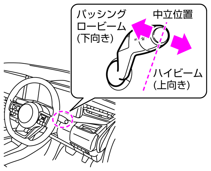 ヘッドランプが点灯しているとき、ライトスイッチを車両前方に押すとハイビームに切り替わります。