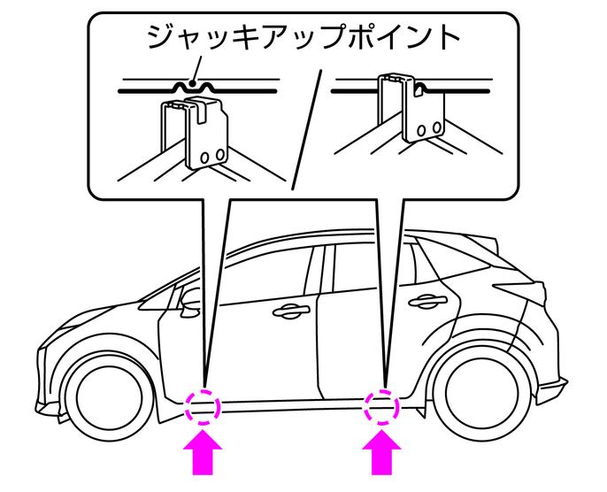 ジャッキアップポイント以外にはジャッキをかけないでください。車体が変形するおそれがあります。