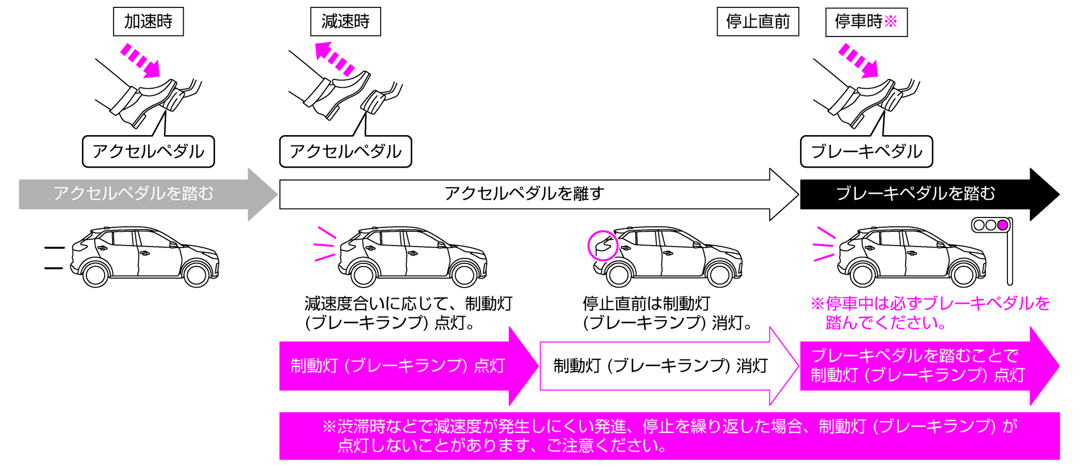 アクセルペダルを離した際、発生する減速度合いに応じて制動灯(ブレーキランプ)を点灯させて、停止直前に消灯します。停車中はブレーキペダルを踏むことで、制動灯(ブレーキランプ)が点灯します。