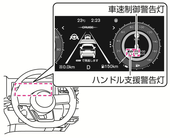 プロパイロット(ナビリンク機能付)に異常があると、ハンドル支援警告灯および車速制御警告灯がオレンジ色に点灯します。