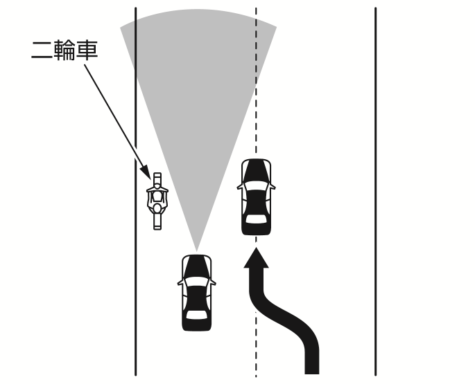 • オートバイのような幅が狭い車両が前方を走行しているとき