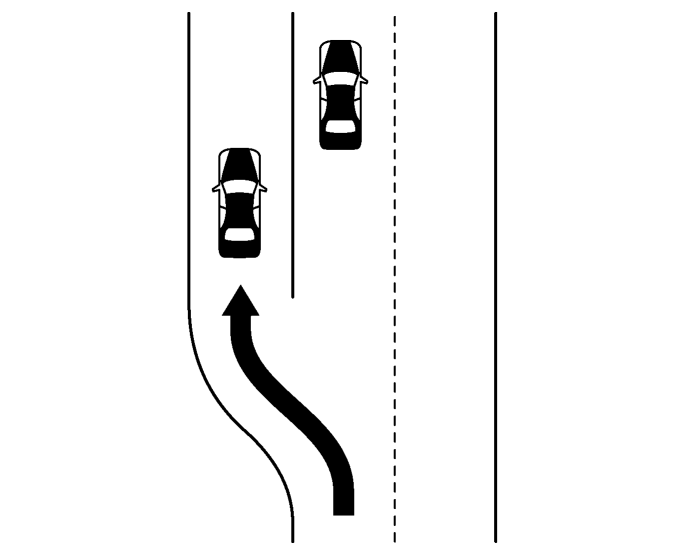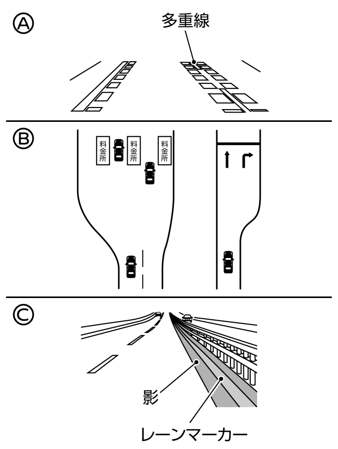 • 料金所や交差点手前などでレーンマーカーがない、またはレーンマーカーが大きく変化しているとき(B)