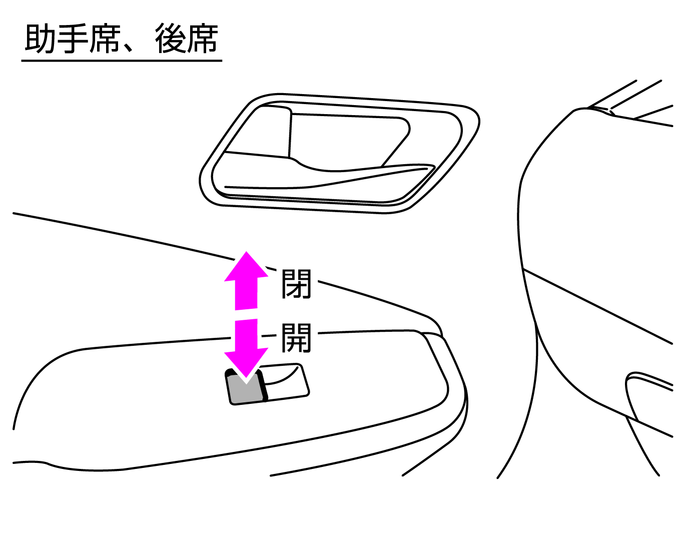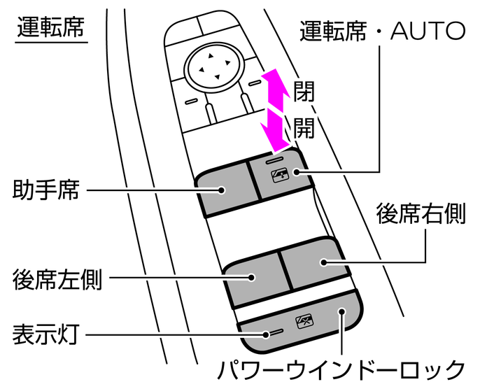 運転席のスイッチで、各席の窓ガラスの開閉ができます。助手席のスイッチおよび後席のスイッチでは自席の窓ガラスの開閉ができます。