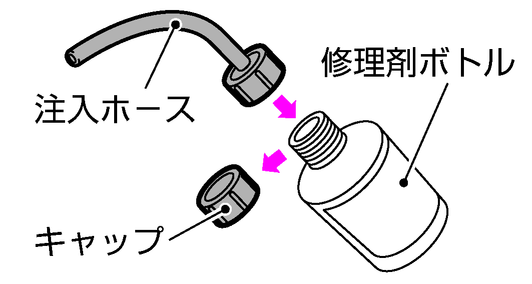 修理剤ボトルのキャップを外し、内ぶたを付けたまま注入ホースをねじ込みます。