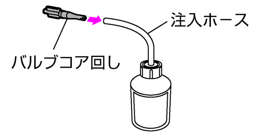 注入が終わった空ボトルから修理剤が漏れるのを防ぐため、注入ホースの先端にバルブコア回しを差し込んで栓をします。