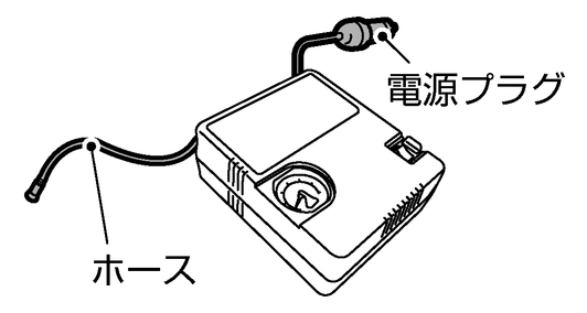 エアコンプレッサーに格納されているホースと電源プラグを取り出します。