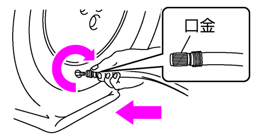 エアコンプレッサーのホースの口金をタイヤバルブにしっかりとねじ込みます。