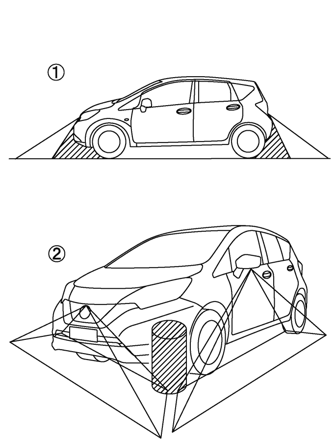 特定の領域は、カメラに映し出されません。フロントビューまたはリヤビューでは、バンパー下側または地上面の部分は表示されないことがあります(1)。トップビューではカメラの映し出す範囲の境目付近にあるもの、路面より高さのあるものは表示されないことがあります(2)。