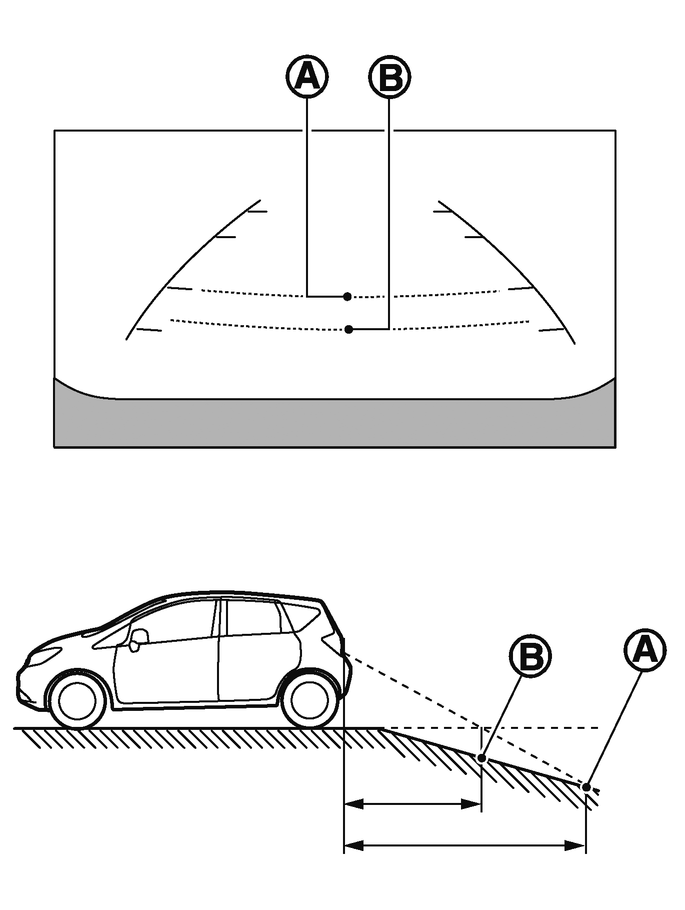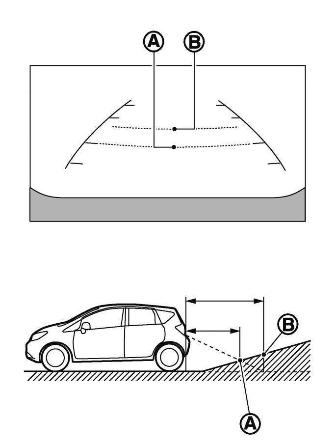 距離目安ラインと車幅目安ラインは実際の距離よりも後ろに表示されます。例えば、位置(A)までの距離が1mと表示されていても、実際に1mの距離にあるのは、位置(B)です。下り坂に障害物があるときは、障害物は実際よりも近くにあるように見えます。
