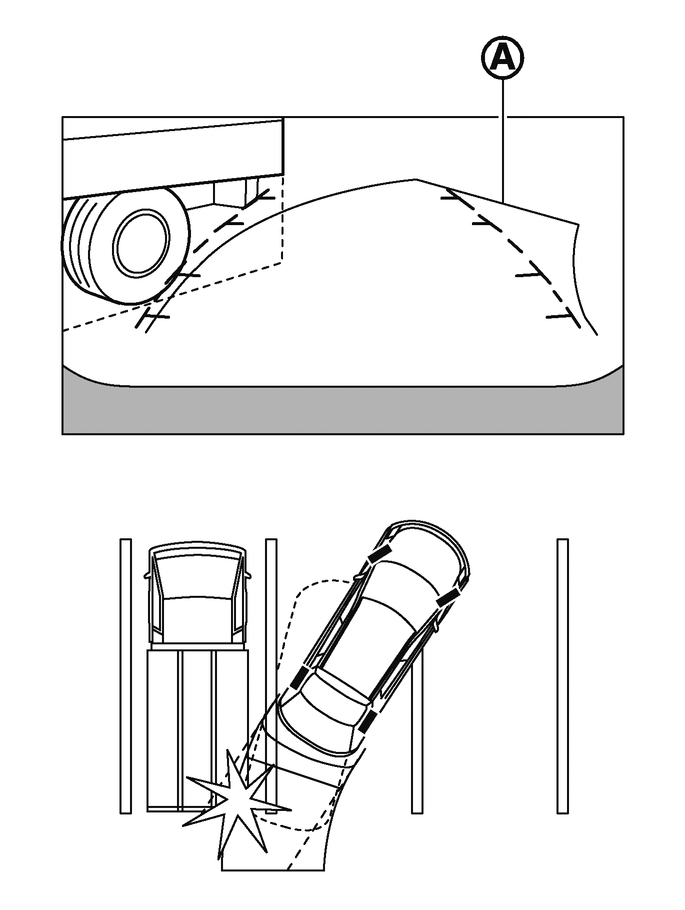 例1:予想進路線(A)は表示されているトラックの車体に触れていません。しかし、トラックの車体が実際の進路上に張り出している場合は、ぶつかることがあります。