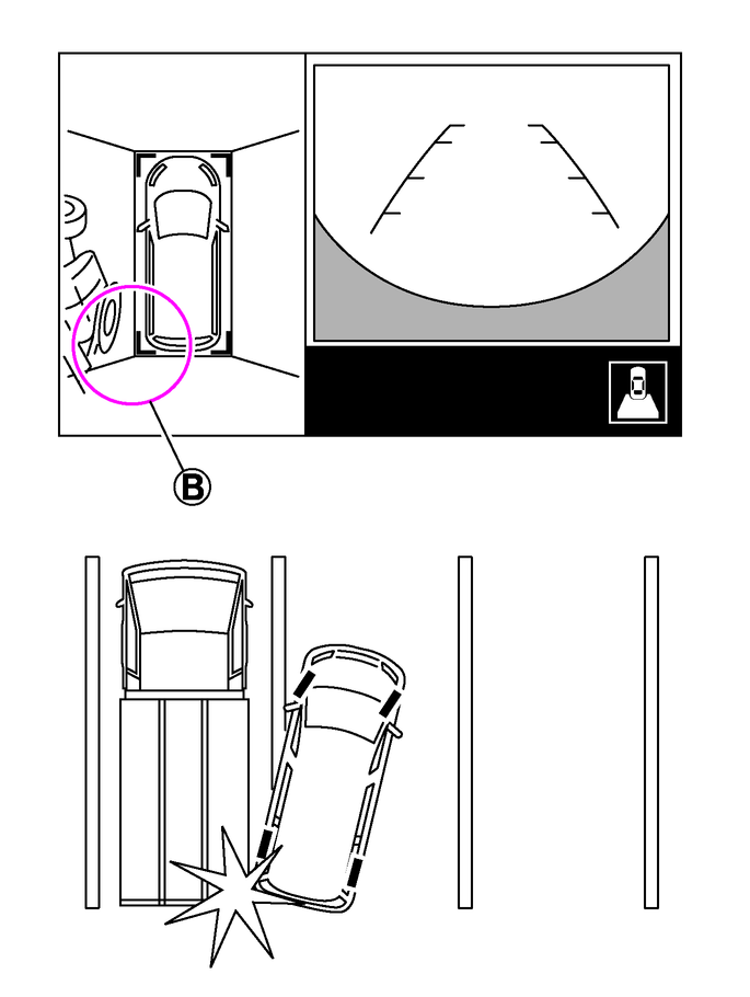 例2:表示されているトップビュー(B)では、自車とトラックの車体間にはわずかな距離があるように見えます。しかし、実際の距離は表示されているよりも短く、トラックの車体にぶつかることがあります。