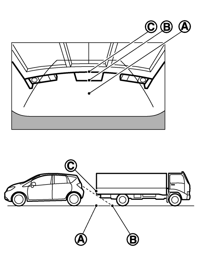 (C)の位置は(B)の位置よりも遠くにあるように見えますが、実際は(A)の位置と同じ距離です。トラックの車体が実際の進路上に張り出している場合は、(A)の位置まで下がるとぶつかることがあります。