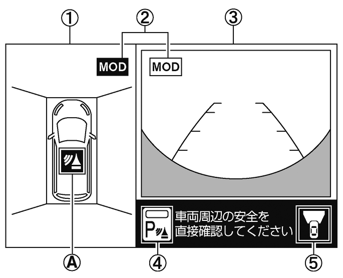 パワースイッチをONにしてから初めてインテリジェント アラウンドビューモニターを表示したときに、アイコン(A)の色と点滅(約3秒間)で、ソナーの作動状況を表します。