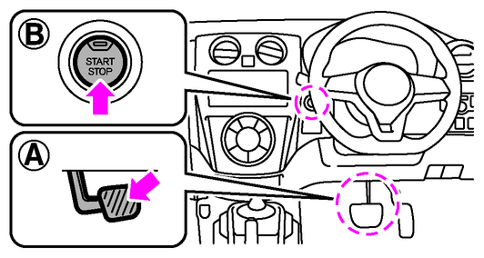 ブザーが鳴ってから10秒以内に、ブレーキペダル(A)をしっかりと踏み込みながら、パワースイッチ(B)を押します。