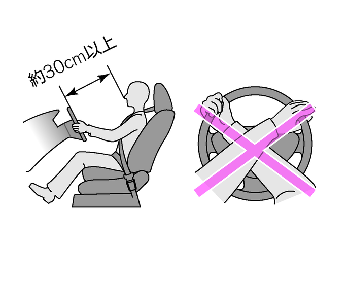 運転席のSRSエアバッグ格納部に身体を近づけない。また、内がけでのハンドル操作はしない。