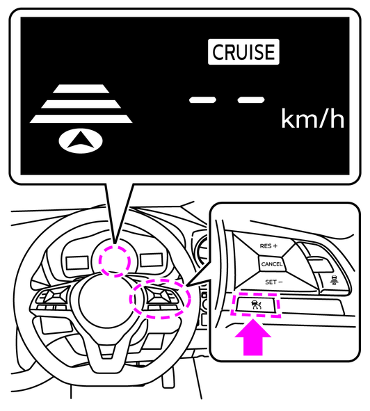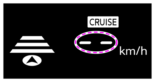 ・車両情報ディスプレイ(走行支援機能表示)にクルーズ表示灯、車間設定表示、設定車速表示が点灯し、セット待機状態になります。