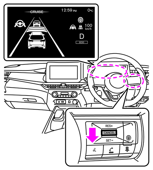 (車速約30km/h以下で先行車を検出しているときにスイッチを押した場合、設定速度は30km/hになります。)