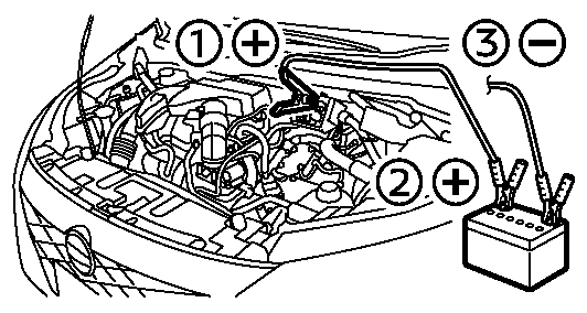 手順5で接続したケーブルの反対側(2)を救援車の12Vバッテリーの⊕端子に接続します。