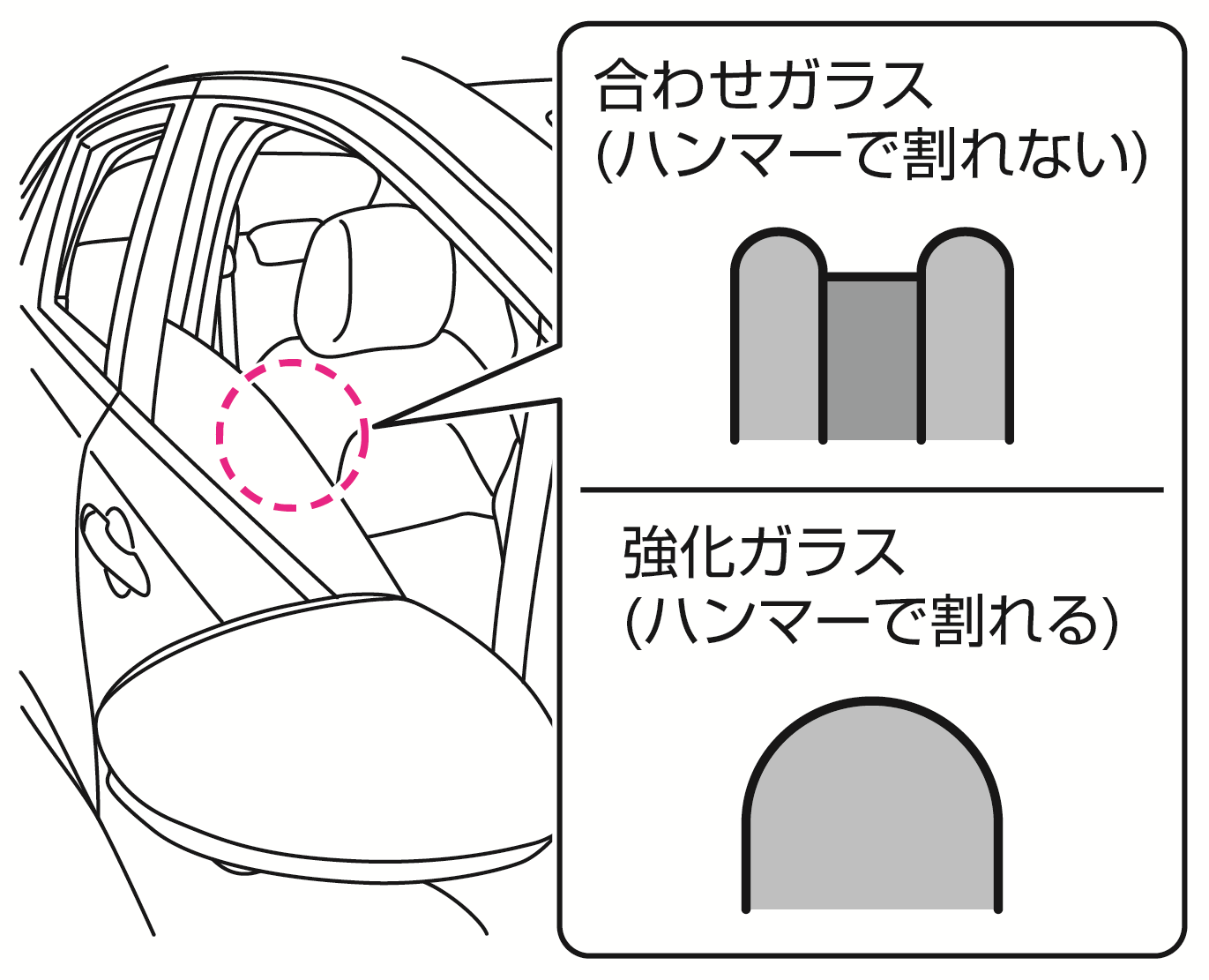 フロントウインドーガラスは合わせガラスのため、緊急脱出用ハンマーで割ることはできません。リヤドアガラス、バックドアガラスを割って脱出してください。