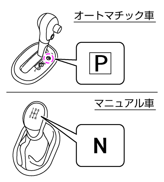 パーキングブレーキがかかっていることと、シフトレバーがNであることを確認します。