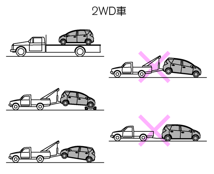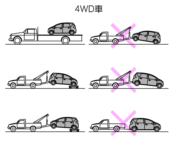 車両を運搬するときは、2WD車は前輪または4輪を、4WD車は4輪を持ち上げてください。