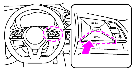 を1.5秒以上押して定速制御機能をON(クルーズ表示灯が点灯し、セット待機状態になります)にします。