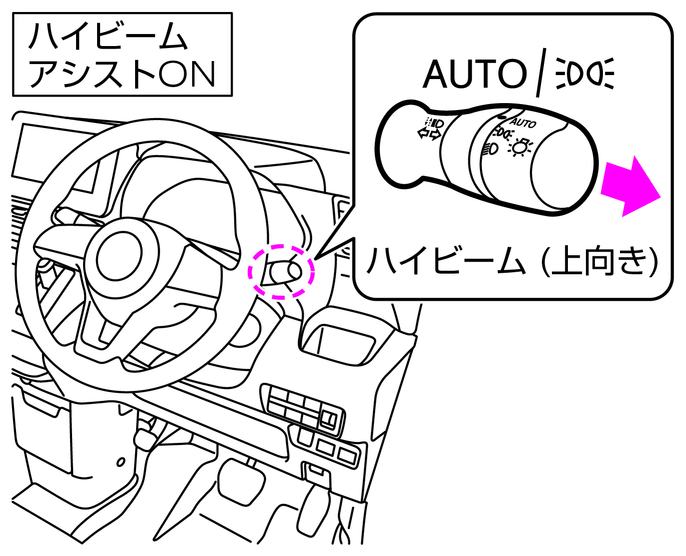 の位置でレバーを車両前方に押すと、ハイビームアシストがONになります。(メーター内のハイビームアシスト表示灯