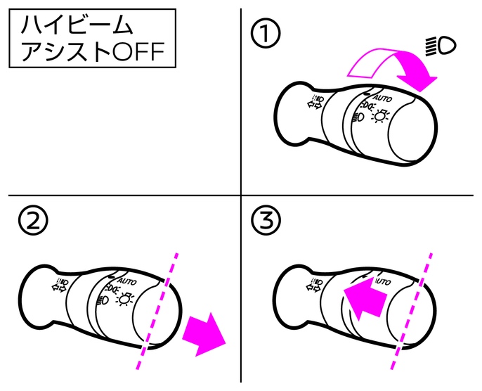 ハイビームアシストがONでロービームのとき、ライトスイッチを車両後方に引くとパッシングになります。